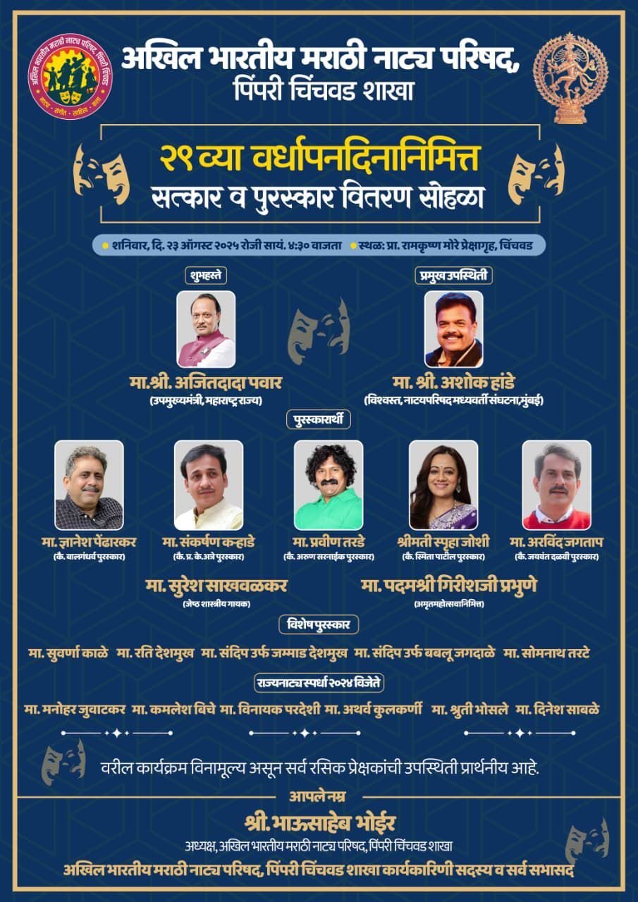 पुढे बोलताना भोईर म्हणाले,नाट्य परिषदेच्या वतीने पिंपरी-चिंचवड शहरात नेहमीच सांस्कृतिक व सामाजिक उपक्रम राबवून शहराचे सांस्कृतिक वैभवात भर घालण्याचे कार्य करण्यात येते. शाखेने आजतागायत दोन नाट्य संमेलनाचे यशस्वी आयोजन केले आहे. त्यामुळे पिंपरी-चिंचवड शहराच्या नावलौकिकात भर पडली आहे. या वर्षीही दि. २३ ऑगस्ट २०२५ रोजी सायं. ५ वा. प्रा. रामकृष्ण मोरे प्रेक्षागृह, चिंचवड येथे शाखेच्या २९ व्या वर्धापन दिनानिमित्त पुरस्कार वितरण समारंभ आयोजित केला आहे. यावेळी मा. अजितदादा पवार, उपमुख्यमंत्री महाराष्ट्र राज्य, यांच्या शुभहस्ते हा पुरस्कार सोहळा संपन्न होणार आहे. तसेच अखिल भारतीय मराठी नाट्य परिषद, मध्यवर्ती संघटना, मुंबई चे विश्वस्त मा. अशोक हांडे हे या कार्यक्रमास प्रमुख पाहुणे म्हणून उपस्थित राहणार असल्याचे त्यांनी सांगितले.