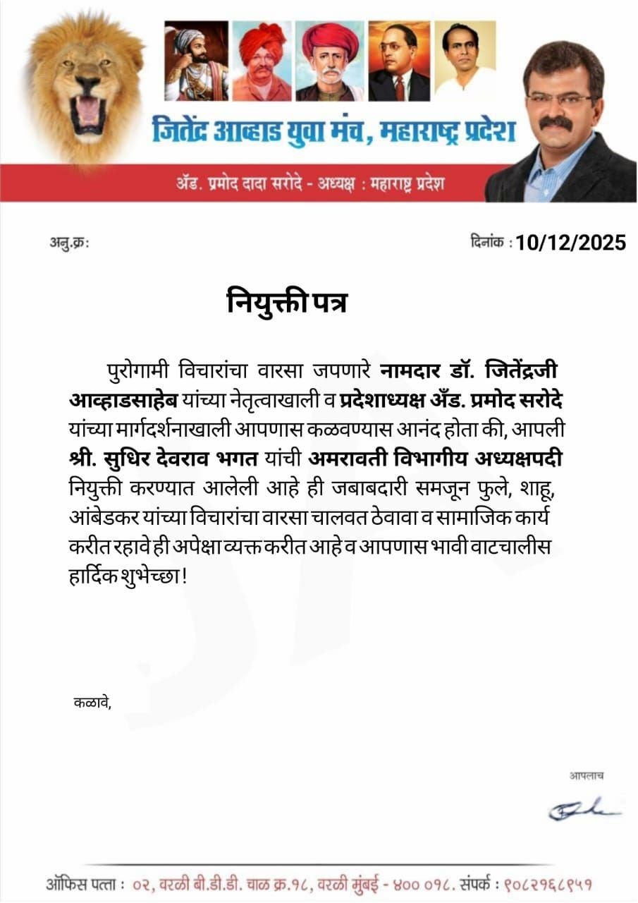 17 डिसेंबर:महाराष्ट्र राज्याचे माजी कॅबिनेट गृहनिर्माण मंत्री तथा आमदार जितेंद्र आव्हाड यांच्या आदेशानुसार जितेंद्र आव्हाड युवा मंचच्या अमरावती विभाग अध्यक्षपदी सुधीर भगत यांची निवड करण्यात आली आहे. या निवडीचे अधिकृत पत्र महाराष्ट्र प्रदेश अध्यक्ष प्रमोद सरोदे यांच्या हस्ते सुधीर भगत यांना देण्यात आले.