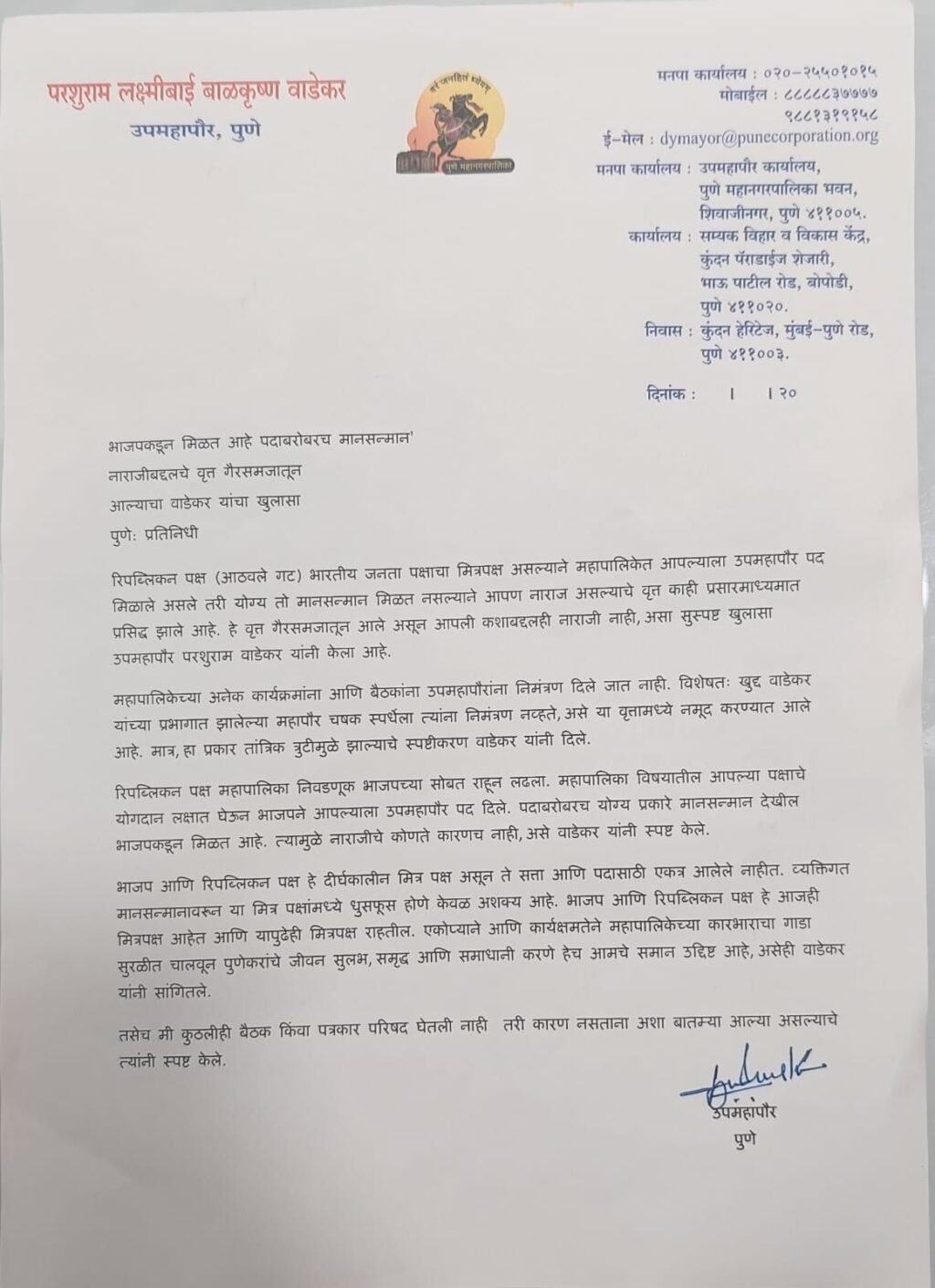 पुणे महापालिकेचे उपमहापौर परशुराम वाडेकर यांनी आपल्या नाराजीबाबत प्रसिद्ध झालेल्या वृत्तांचे खंडन करत स्पष्ट केले की, अशा बातम्या पूर्णपणे गैरसमजातून पसरल्या आहेत. भारतीय जनता पक्ष (भाजप) आणि रिपब्लिकन पक्ष (आठवले गट) हे मित्रपक्ष असून आपल्याला पदाबरोबरच योग्य तो मान-सन्मान मिळत असल्याचे त्यांनी सांगितले.