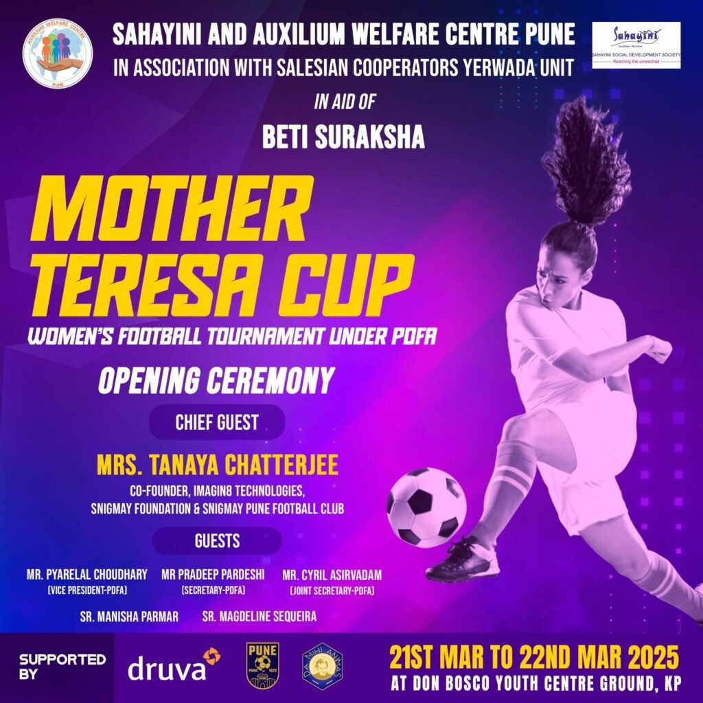 पुणे : सहयिनी सामाजिक विकास संस्थेच्या पुढाकारातून आणि ऑक्सिलियम कल्याण केंद्र पुणे तसेच सेल्सियन सहकारी येरवडा युनिटच्या सहकार्याने ‘बेटी सुरक्षा’ या महत्त्वपूर्ण उद्दिष्टासाठी आयोजित करण्यात आलेल्या ‘मदर तेरेसा कप’ POFA अंतर्गत महिला फुटबॉल स्पर्धेचा आज उत्साहात शुभारंभ झाला.