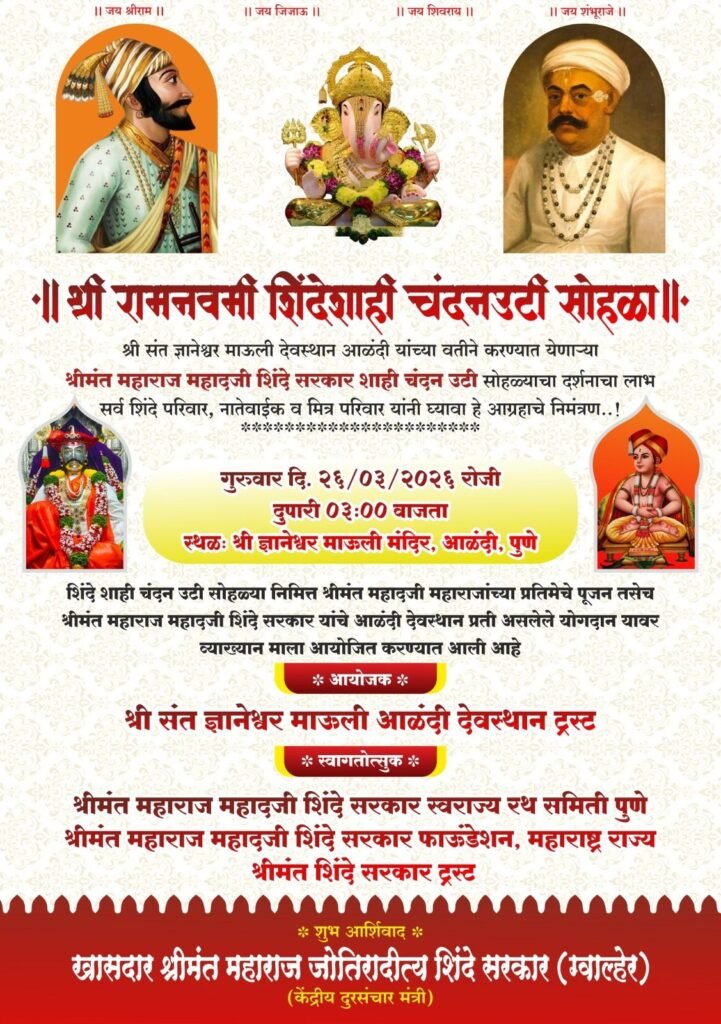 पुणे, आळंदी (प्रतिनिधी): श्री रामनवमी निमित्त आळंदी येथील श्री संत ज्ञानेश्वर माऊली देवस्थानाच्या वतीने भव्य शिंदेशाही चंदन उटी सोहळ्याचे आयोजन करण्यात आले आहे. या सोहळ्याचे आयोजन गुरुवार, दिनांक २६ मार्च २०२६ रोजी दुपारी ३:०० वाजता करण्यात आले आहे.